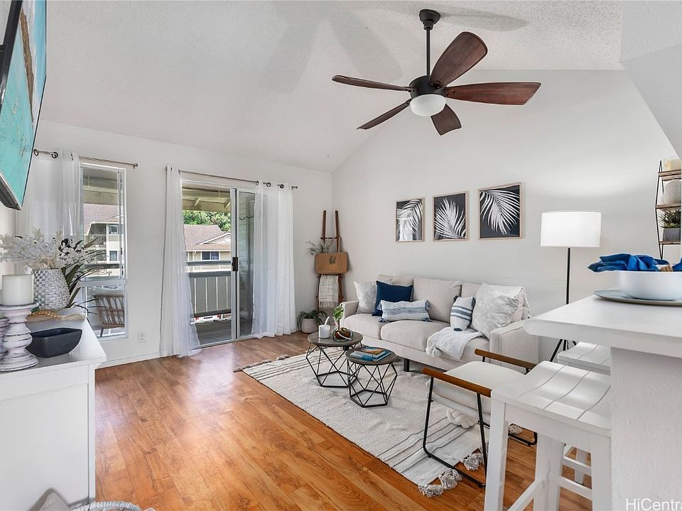 Welcome to the Ridge at Launani Valley! This charming property presents a two-bedroom, one-bathroom residence with the added luxury and convenience of TWO dedicated parking spaces— one open and one covered. As you enter, you are welcomed with soaring vaulted ceilings that add an immediate sense of grandeur, expanding the spatial ambiance to new heights. The generously proportioned windows and an open pathway to the lanai create a seamless connection with the outdoors, ushering in natural light that bathes the living space in a warm and inviting glow. Enveloped by the gentle caress of cool breezes, this residence offers a harmonious blend of open design and natural elements, promising a captivating and refreshing living experience. Nestled in the heart of Mililani, this home combines a tranquil neighborhood setting with proximity to essential amenities.