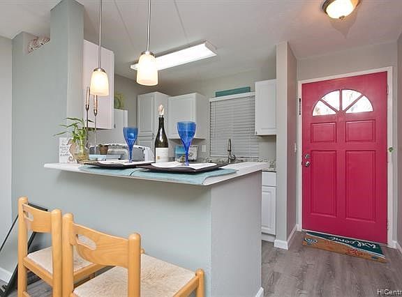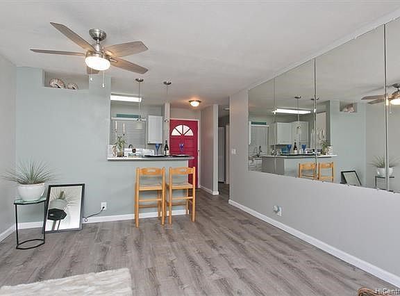 Dream come true ... Brand new completely remodeled & renovated! Gorgeous, modern, spacious, & bright 2 bed 2 bath 2 parking (open & covered) townhome on the ground floor w/ Serene Treetop Views from Lanai. Located on the perimeter with no neighbors in back! All new: vinyl plank floors, custom designer paint, pendulum lights above bar, appliances in kitchen, sinks/faucets/cabinets/mirrors in kitchen & both baths, ceiling fans, brushed nickel fixtures, updated electrical switches & plugs, baseboards & trim, stylish floating cabinet in bath, tubs w/ surround, toilets, quiet bathroom exhaust fans w/ light, & much more!. PET FRIENDLY!! Walk your pooch around this Lush & Cool area of Mililani. Close to Mililani Shopping, Golf courses. A luxury feel at an affordable price! 1st Open Sunday 2/3!