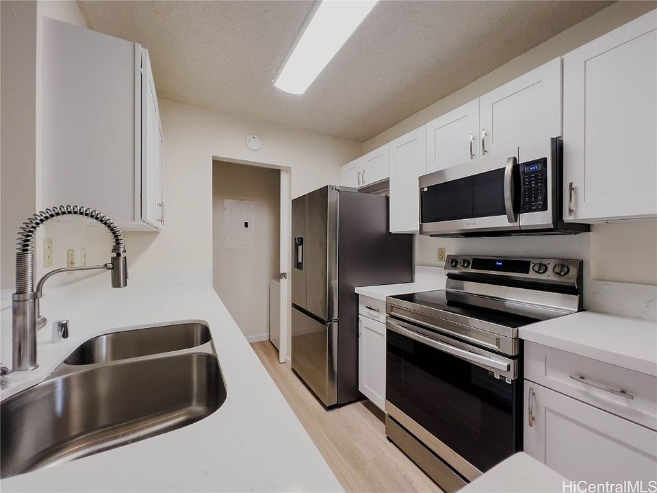 Price Improvement on this wonderful condo! Remodeled and ready for you to make this your home. All the hard work is done so you can be worry free. Just pick your color for window coverings and you are all set. Beautifully updated unit with all new flooring that includes upgraded carpet in living and bedrooms, kitchen cabinets and countertops, bath, and all appliances; french door refrigerator, glass top oven, dishwasher, and microwave. There is a dedicated walkway to this a highly desirable 3-2 split bedroom floor plan and it is a top corner unit that catches all the breezes. There is even a new window AC for the rare days when you want it a bit cooler. Enjoy the pool, spa, BBQ and play areas as well as access to the Launani Valley Association tennis, pickleball, basketball courts and walking path. Close to H-2, Wheeler, Schofield, Mililani town and North Shore. This is a peaceful area that lets you feel away from it all while still being within easy access of town amenities. Two assigned parking stalls. One covered parking stall conveniently located right outside the door. Guest parking is also available. Pet friendly.