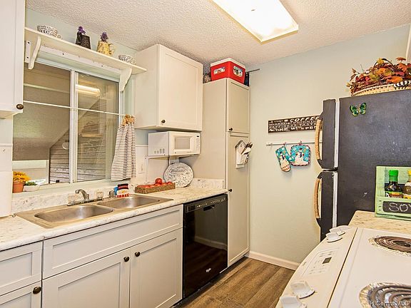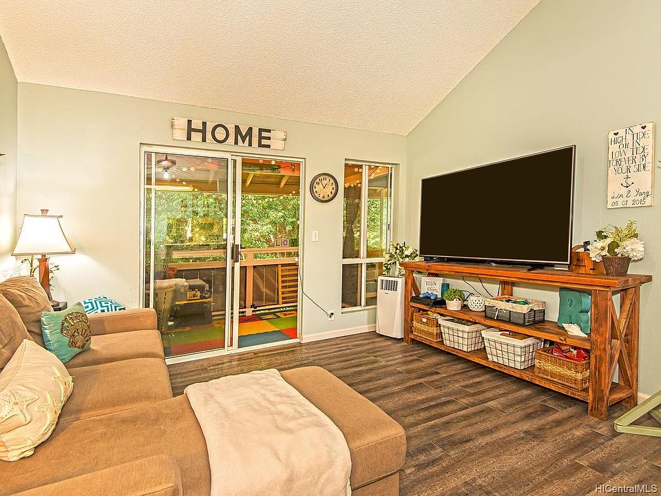 Very cute 2 Bedroom, 1 bathroom town home in very green,cool breezes Launani Valley. It is just minutes to Schofield Barracks and Wheeler Army Airfield; right away to H-2 Access; convenient to Mililani Town shopping, entertaiment, etc.. It located on the third floor corner with a very private lanai all green trees in the back. Upgraded with vinyl flooring, tasted painted all walls. It has two parking stalls. You will enjoy the pool; club house; BBQ etc. Pet friendly with 2 up to 25LBs.