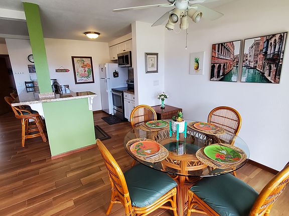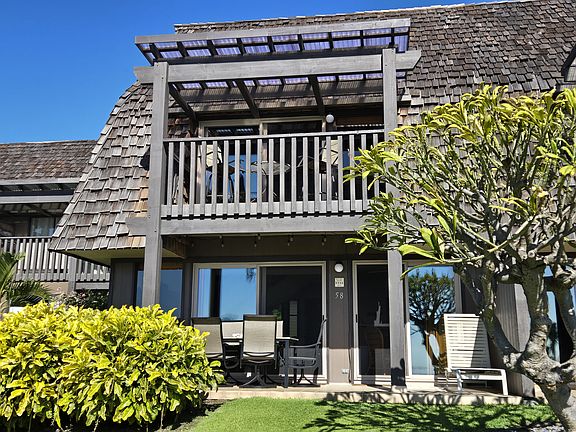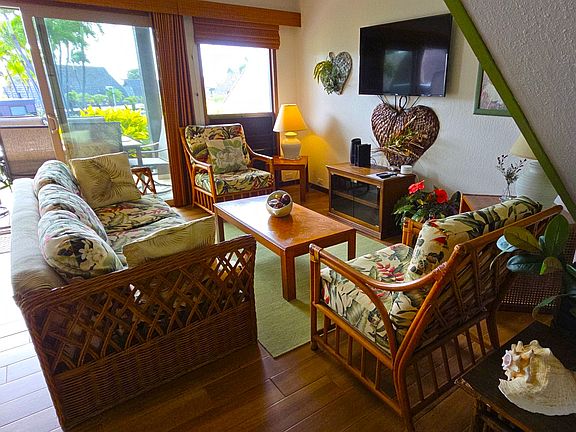 With two spacious bedrooms, this condo comfortably accommodates guests. The master suite upstairs features a king-size bed and a full bath, while the downstairs bedroom offers a cozy queen-size bed. The sofa in the living area also provides a full sleeper, ideal for extra guests. Enjoy beautiful ocean views right from your lanai (patio), where you can sip a cup of locally grown Ka'u Coffee and bask in the natural beauty of the islands.