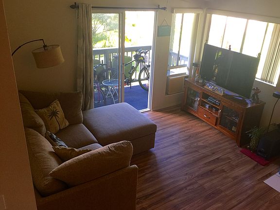 Cool, quiet, breezy unit; corner upstairs unit, private with forest views. Vaulted ceilings, high grade laminate flooring, lanai, two beds, two parking, two baths. Easy to see!