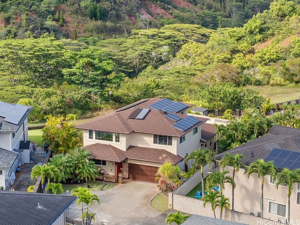 Experience Mililani Mauka's finest with this rare American Classic Residence 6 floorplan. Situated on the perimeter, this home is 4 bedrooms and 3.5 baths with added features including an open floor plan that provides combined living area for multi-generational living. Two primary suites with private baths, walk-in closets are exceptional in size and present many living options with one being on the 1st floor. Features include split A/C, 28 owned PV panels on NEM, solar water, new roof in 2020, stainless appliances and more. This unparalleled property has a long-extended driveway providing ample parking and sits on a 12,352 sq. ft. flag lot. This rare home includes a 3-car tandem garage and is nicely oriented to accentuate the oversized side yard with plenty of room for a pool. Schedule a private tour TODAY!