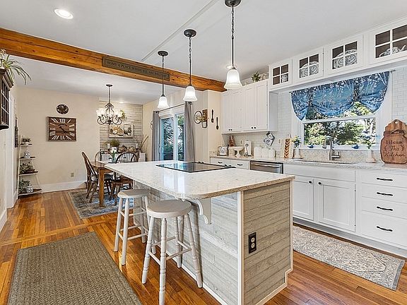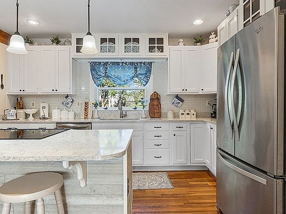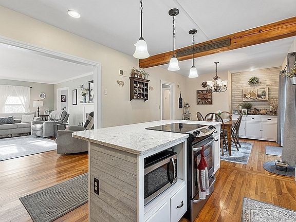 Come see this beautiful cape today! This 4 bedroom, 2 bathroom cape is ready for you to move right in. The 1st-floor features a nice open concept with hardwood floors throughout. The kitchen features a large island with pendant lighting, quartz countertops, a subway tile backsplash and stainless steel appliances. The kitchen opens up nicely to both the living and dining rooms. The living room features a beautiful brick-faced fireplace. 2 bedrooms and a full bathroom wrap up the 1st-floor layout. On the 2nd-floor you'll find 2 very large bedrooms and another full bathroom as well as the laundry room. Outside you'll find a 2-tiered deck overlooking the gorgeous backyard. The backyard features several mulch beds with mature plantings as well as a fire pit area and stone wall! The attached 2-car garage is great for storage or for keeping the weather off your car. New heating system. Come see this home today!!!