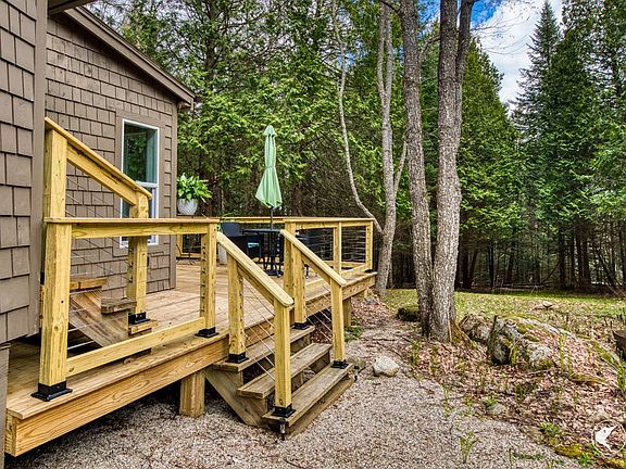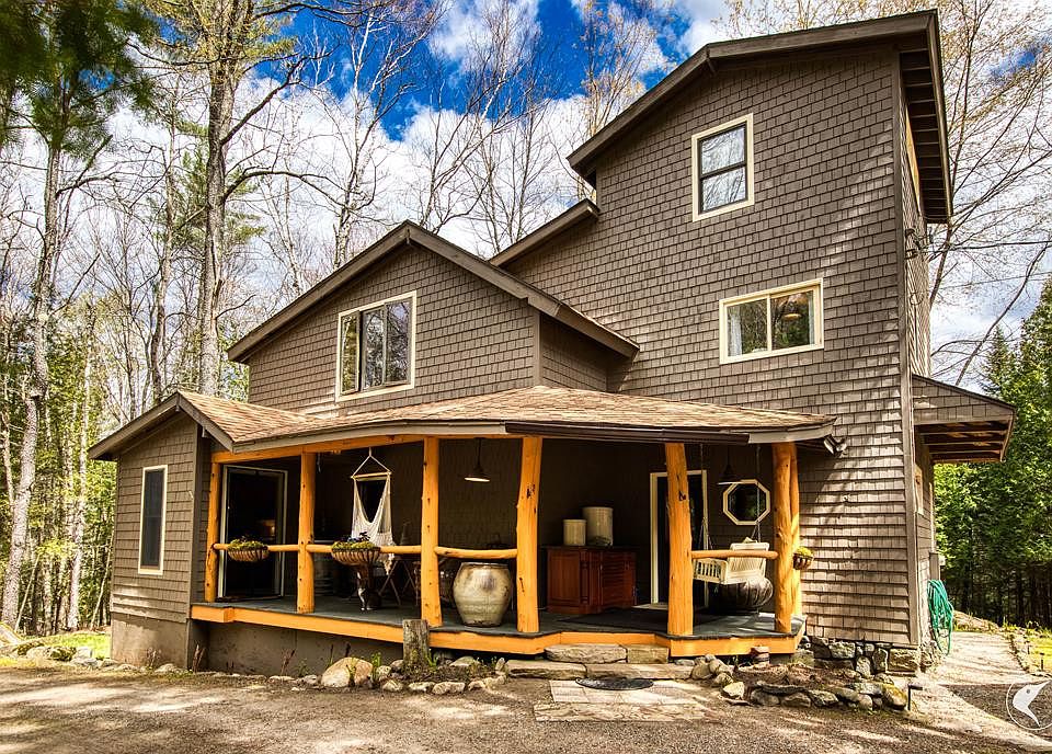 Enjoy a feeling of seclusion while only minutes from downtown Saranac Lake in this contemporary 2 bedroom, 2 & 1/2 bathroom home. Unique architecture features a wrap around porch leading via two entry points to the large, open, family, dining & entertainment space flanked by dual staircases leading the two bedrooms stacked in the "tower". Each bedroom is complete with an en suite bathroom & a loft leading to the primary bedroom on the third level adds a separate office/ den space with laundry hookups as well. A modern kitchen with adjacent bar, cathedral ceilings, an inviting foyer & a downstairs powder room surround the living area, stepping down into the dining area & sitting room/ sun room which exits onto the recently built deck overlooking the terraced yard. Situated on a half acre corner lot on a semi private road, this house features high end finishes & artisanal design cues while evoking the Adirondack vernacular. A partially enclosed garden house adds utility & charm.