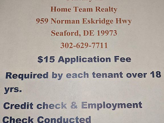 Application must be completed and approved before showing. Application can be completed online through Zillow.com or in person at our Seaford office located at 959 Norman Eskridge Hwy. Seaford DE 19973 Tenant is responsible for all utilities, appliances and lawn care.