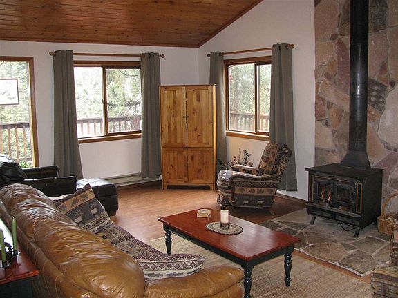 This is a fantastic family home featuring 2 large living areas. The upper area features an open living/kitchen/dining design and has a wood burning stove to help with heating costs. The large downstairs area is perfect for bunk room, game room or man cave and has a fireplace. Landscaped yard, dog run, nice deck and room to roam. It's located just blocks from Monte Verde Lake and close to hiking trails. The house is being sold unfurnished.