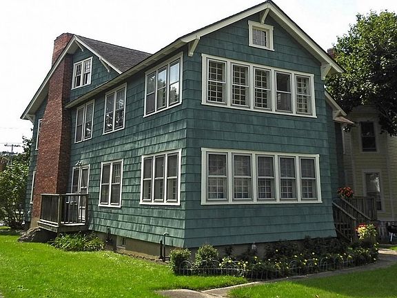 Uniquely designed property with an abundance of windows to allow the natural light to fill the living spaces and in a prime location with views of Main Street Park out the sunporch windows, two blocks from the Library and all of downtown just beyond. Hardwood floors throughout, radiator style heating, two bedrooms in each apartment and a full size living room and dining room plus the sunporch. There are washer and dryer hookups in the basement as well as locked storage spaces and separate heating units. Adequate green space and parking for four vehicles.