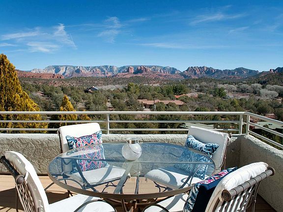 This beautiful Santa Fe style Sedona home has some of the best panoramic views in Sedona. The house looks east to all of the Chapel Rock area monuments including Cathedral Rock, The Madonna and Child, Elephant Buttes and The Mermaid plus overlooking the beautiful Oak Creek greenbelt through a solid wall of windows. A large deck overlooks this magnificent view making this outside splendor a part of your living space. The home boasts real wide plank wood floors throughout, with a modern floor plan, generous room sizes, no wasted space and lots of storage. The bathrooms and kitchen have been renovated with updated appliances, cabinetry, fixtures, etc. This home is beautifully presented and so full of character, with rough mudded walls and arches and