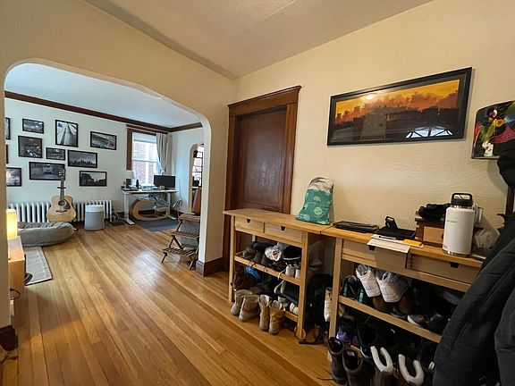 Great layout with common area on one side and private living on the other. Office immediately off the entrance serves as a perfect space for coats & shoes or a desk and leads to a spacious front porch which looks out onto a quiet tree-lined street. Spacious living room with lots of windows and a dining room with charming built in cabinets and new designer light fixtures. Large eat-in kitchen with a pantry that features in unit laundry hook-up. Two large bedrooms each of which can easily fit a queen sized bed with room to spare. Deep closets throughout the unit and pantry space off the kitchen. Front and rear porches with off-street parking! Laundry hookups in basement. Close to B line train, Whole Foods, Brighton Center, and Commonwealth Ave.