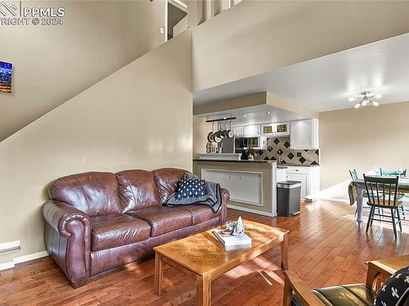 Really sharp looking town home with Central air in Manitou Springs! Open and bright with vaulted ceiling in the living room. A wood burning fireplace in the living room can be enjoyed from the dining area and the kitchen. Wood" floors on the main level. A breakfast bar and open floor plan with the dining area and living room offering a casual living space. Walk out to your private patio from the dining area to relax or have a BBQ. Stainless steel appliances stay in the kitchen and includes a dishwasher, range oven, refrigerator, and a countertop microwave oven. A large closet offers for tons of storage. A half bath is conveniently located off of the kitchen and laundry room, washer and dryer go with the sale and are near the entrance to the attached one car garage. Stairs led up to 2 large bedrooms and a full Jack and Jill bathroom. The upper-level master bedroom has a big walk-in closet. In the Basement you can use as second primary suite or a recreation room with a full bath. Possibilities are endless in this space. There is an additional parking space assigned to the townhome just a short distance from the front door. Located with convenient access to trails, downtown Manitou, city swimming pool, parks, and Highway 24. An easy walk or bike ride to downtown Manitou Springs. Close by is Crystal Park Cantina or Savelli's Restaurants. Plenty of wildlife in the neighborhood, including wild turkeys and hummingbirds. This is a definite must-see property!
