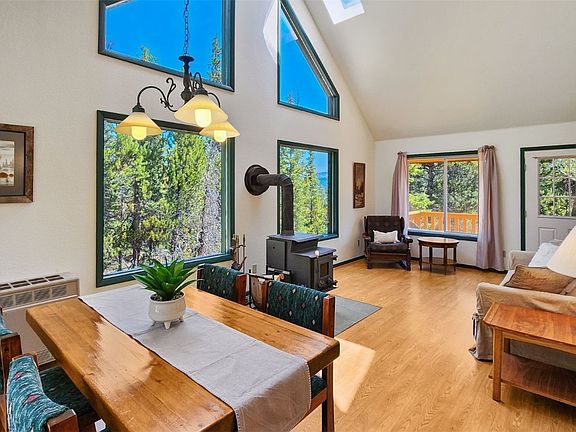 Charming home on 10 acres with a mix of mature pines, mountain views and a gentle slope to a trail that runs the length of the property. Trail is perfect for hiking or biking! This meticulously maintained home, located on a private road, presents the perfect touch of rustic charm, making it a true haven for nature enthusiasts and those seeking a retreat away. Home features a fresh coat of paint, large balcony from the primary bedroom upstairs, large deck with ground access off the great room, skylights, 768 sq ft of unfinished basement with a walk out, and 1236 sq ft finished with 3 bedrooms and 2 full bathrooms. Potential for 2004 sq ft once the basement is completed! Stunning mountain views from the floor to ceiling windows in the great room which allow for all day passive solar heat. Home was solar and was upgraded to electricity. Rarely visited after construction so all appliances and utilities are still operating as new with little use over the years. Make this home your today!