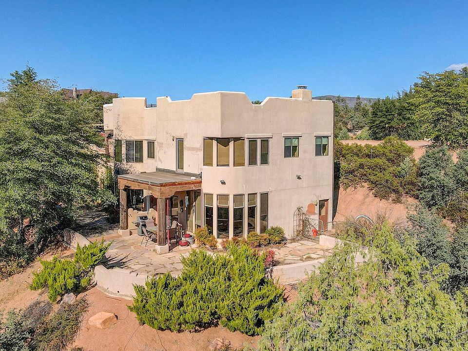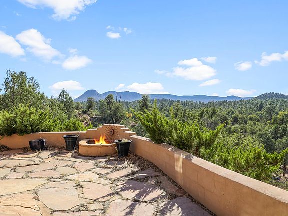 Rare find brimming with potential! Private, two-story Santa Fe-style retreat. Enter through a serene courtyard that sets the tone for seclusion and charm. The spacious flagstone patio provides the perfect vantage point to unwind and take in breathtaking views of the National Forest and unforgettable Arizona sunsets. Inside, the inviting great room welcomes you with soaring ceilings, a cozy fireplace, and expansive mountain views, creating an atmosphere of warmth and comfort. The kitchen complements this aesthetic with rustic wood cabinetry, a hooded gas range, and ample space for culinary creations. Upstairs, you'll find a generous primary suite complete with a spacious bathroom, separate shower and tub, and a private balcony with endless views. Two additional bedrooms share the second level, including one with its own private balcony.