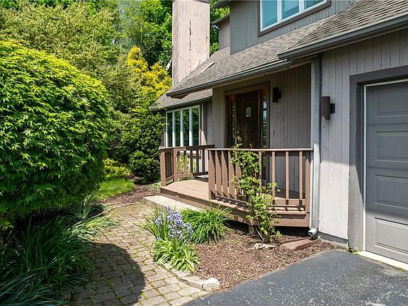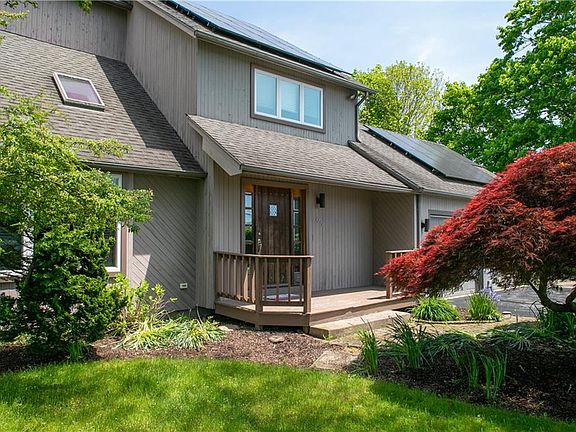 Contemporary style home sited on a beautiful half acre corner lot with mature trees and plenty of room to play! The light and airy family room has vaulted ceilings and a gas fireplace. The modern kitchen offers plenty of seating and storage, with a generous island for meal prep. There is a large dining room perfect for family gatherings. The half bath and laundry area round out the first floor. Upstairs you’ll find the primary suite with vaulted ceilings and skylights, boasting a renovated ensuite bathroom with a large beautifully tiled shower. Down the hall you’ll find 2 bedrooms and an updated bathroom with tub/shower. The partially finished basement offers bonus space, perfect for a playroom, recreation room or home office. 2 car garage, gas heat & Central AC! Improvements have been made in recent years: updated central AC, septic system and solar panels. *3.125% Assumable VA Loan for Qualified Buyers* Lease in place until October 2024. Home is being sold As-Is.