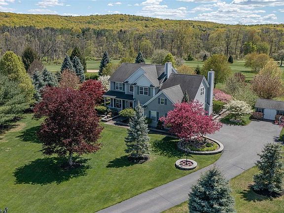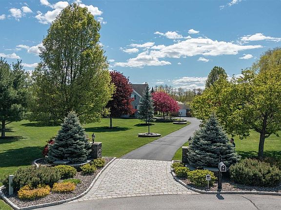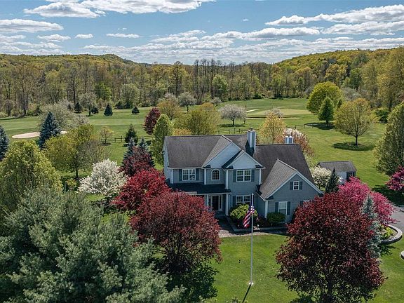 Sited in The Fairways at Red Hook golf community, and at the very end of a cul-de-sac, the entrance to this property is adorned with cobblestone-style pavers and lighted stone pillars that blend seamlessly with ornamental plantings. Further welcoming you is a stunning landscape, sprinkled with varied deciduous and evergreen trees as well as impeccable stone-lined flower beds that showcase the annuals and perennials. The covered front porch with sitting area is the perfect transition into the double-height foyer of this classic colonial design with farmhouse influence. The 9-foot ceiling height on the main level adds a sense of volume to each space, the specially layered door/window trim and crown molding add an element of depth, and the hardwood floors throughout add a feeling of warmth and clean lines. Just right of the foyer is a private office with double French doors, and to the left is a spacious living room with a floor to ceiling bay window, which is separate from, yet open to the dining room, both flooded with natural light, and lending themselves to function in unison for larger gatherings. The dining room has direct access to the well-appointed kitchen with ceramic tile flooring bordered by a pebble stone trim detail. Ample cherry-toned wood cabinetry, a black appliance package and granite counters complete this space that transitions to a dinette area with dry bar and then to a vaulted family room with gas fireplace. This great-room concept spills out to a fantastic Trex-style deck and custom paver patio that is enveloped by lush landscape. The 2nd level of this home is host to the primary bedroom suite with cathedral ceiling, walk-in closets and an elegant private bath with double vanity, soaking tub and walk-in shower. Three additional bedrooms are all gracious in dimension, and are serviced by a stylish hall bath. Throughout the home there are special views, most notably of the fairway approach and green of the par-5, 3rd hole. These views can be enjoyed from the home as well as from the inviting back patio, anchored by a hot tub and striking outdoor fireplace. Let the stress of the world melt away while you lounge in the hot tub, soak up the ambiance of a fire or watch the golfers pass by. Additional amenities: zoned central air, central vac, full, unfinished basement, an attached 3-bay garage and garden shed. Located approx 10 min to the villages of Red Hook and Rhinebeck. Easy access to commuter routes. Red Hook School District.