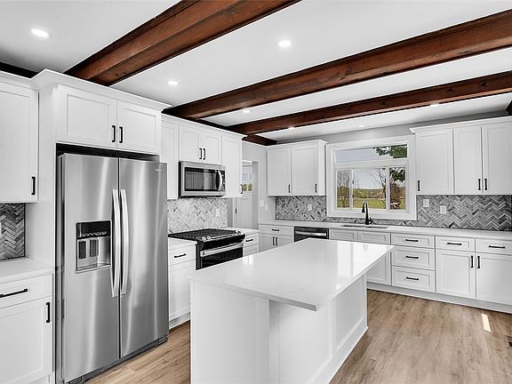 FANTASTIC RENOVATION! NEW kitchen, stainless appliances, quartz counters. NEW LVP flooring on main floor and lower level. NEW two full baths. NEW roof and HVAC. NEW electric panel 200 amp. NEW garage door, driveway, exterior and interior doors, concrete patio. Living room features shiplap wall with fireplace. Master suite with private bath, double vanities, glass enclosed ceramic shower, walk-in closet, and additional closet. Two additional bedrooms with nice closets. Laundry room on main level. Country setting on 1.1 acres with great views!