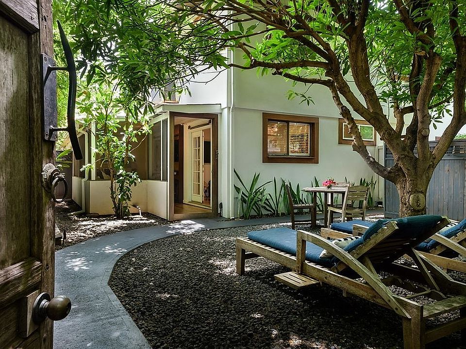 A hidden garden lounge surrounded by lush tropical landscaping offers a peaceful retreat with a fire pit and seating area — perfect for relaxing or entertaining. Additional amenities include parking for two vehicles, a laundry room, and an air-conditioned detached structure suitable for an office or storage.