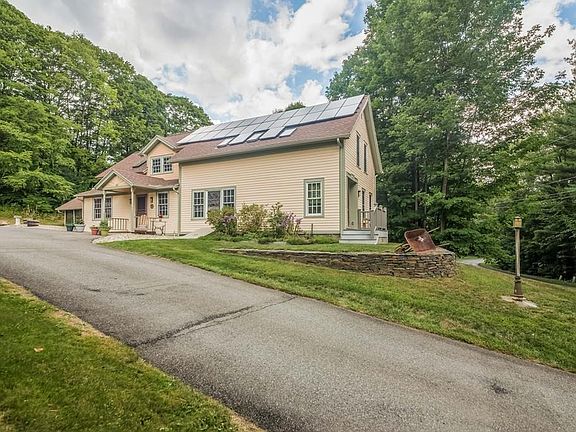 Owned solar panels atop this Colonial-era farmhouse mean you may pay nothing for electric!. Completely renovated for the best of old and new, this 8-Room, 3BR, 2Bath Greek Revival house has new interior walls, wiring, plumbing, insulation, heating, & baths that complement historic wide pine flooring & interior trim. New windows and skylights fill both floors with light. Open floor plan kitchen/great room present custom cherry cabinetry throughout, cement countertops, VT Casting stove, bamboo flooring, & coffee center. Spacious 1st floor MBR suite graced by fireplace w/gas stove insert & full tiled bath/laundry. Hubbarton Forge fixtures, hard-wood floors, stained-glass window, and custom stair tower complete the picture. Two-level barn welcomes an artists loft or a woodworkers shop. Spacious grounds include a Club 40 tennis court, perennial gardens, orchard & Goshen stone walls. Located on wooded 5-acre parcel in beautiful Whately near 5-Colleges, Northampton, and hill towns.