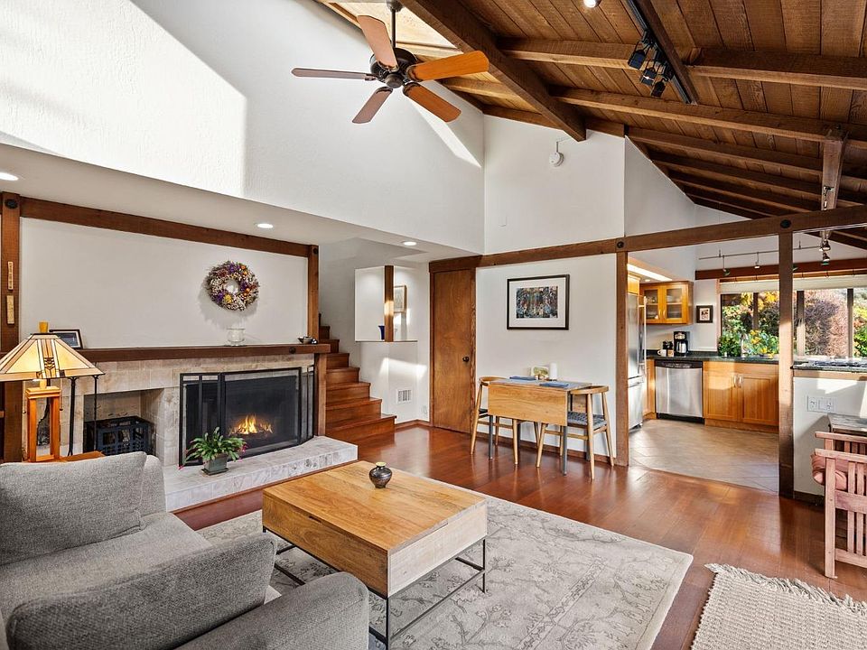 Come home to San Anselmo and fall in love with this updated 2 bed 2 bath home just minutes to the vibrant downtowns of San Anselmo and Fairfax. The charming home has well thought out spaces to maximize enjoyment. Features include wood floors, a designer, custom chefs' kitchen with stone counters and walls of windows to enjoy the lush surroundings and views. Living room with vaulted ceilings and marble faced fireplace opens to a sunny, private deck, great for entertaining, bbq's and al fresco dining. Upstairs offers an en suite primary bedroom with walk in closet and updated bathroom opening to a balcony with views and a cold plunge Cedar tub. Both bedrooms offer lofts to maximize floor space and storage needs. Plus, a detached studio makes a nice home office or retreat. On a 10,000 + sq ft lot with terrific views, backing to open space, on a dead-end road with limited through traffic and covered off-street parking, laundry, and storage. World class hiking and biking trails nearby. Highly rated San Anselmo school district including Hidden Valley Elementary (confirm w district). Come see this exceptional home: beautiful details, mature and colorful landscaping in a well-tended setting.