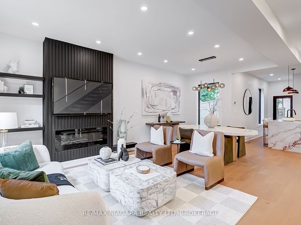 Oversized private lotMature treesBright open-concept main floorLarge windowsWide-plank oak flooringCustom fireplace feature wallDesigner kitchen