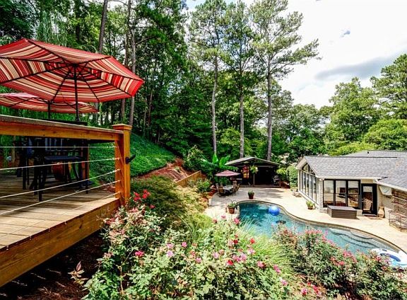 RARE OPPORTUNITY to own a property that feels like a PRIVATE RESORT - TWO BLOCKS FROM CHASTAIN PARK. One-of-a-kind open, renovated ranch home tucked up on a secluded hilltop. Easy one-level living where both the Master and the Keeping Room open out to the heated, salt water Pebbletec pool! Master has spa bath and amazing closet. Third bedroom could double as a home office. Fin Basement has half bath, fitness area and recreation room. Lounge in the shade overlooking the pool in the roomy lanai with power & TV connection. Serene personal retreat OR entertainer's paradise!