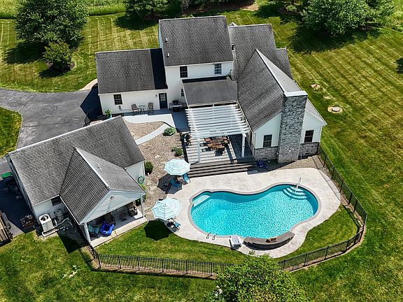 Come home to your own "Retreat" with peaceful and quiet surroundings. This one-of-a-kind property is private and nestled in over 17 acres. A quality-built home by Shaeffer and Son, that features a 1.5-story floor plan, 3522 Sq Ft, 3 BR's 2 full and 2 half bathrooms. There is a first-floor owner's suite, with a walk-in closet, and a bathroom with both a soaking tub and shower. You will spend a lot of time in the cozy country kitchen with upgraded cabinetry, hardwood flooring, and a two-sided gas fireplace that connects to the family room. The great/family room is spacious, and light infused with southern exposure, has a pine cathedral ceiling and LVT flooring. Step down into the game room that also has a cathedral ceiling, wooden beams, pine flooring, a two-story flagstone gas fireplace and a bar. Perfect for entertaining! On the second level there is a spacious loft, full bathroom and 2 bedrooms plus bonus room off of the one bedroom. Tranquil outdoor living at its best with a large, covered patio and pergola that overlooks the beautiful inground saltwater heated pool and rolling hills. Whether relaxing in the shade or basking in the sun, you will always enjoy the spectacular sunsets. The Carriage house/ in-law quarters is an adorable one-bedroom cottage with a full kitchen, bathroom, living area and laundry room. If you need extra space for your recreational vehicles, kayaks etc, there is a detached 2-car garage that includes a separate storage room and covered patio! This property has been lovingly cared for, well maintained and offers endless possibilities. Although very private, Hershey Medical Center and all attractions, Rt 283, shopping etc are just a few minutes away. Also close to PA Turnpike, Rt 322 & 422. Enjoy all the wonderful amenities that this spectacular property has to offer and let it be your new home!