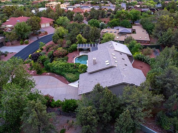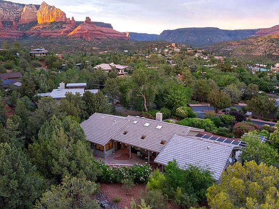 Hidden Utopia in Uptown! Highly desirable location, short walking distance to Shops, Restaurants and Hiking trails. Contemporary single level home with lush landscaping, private setting and totally fenced in. Immaculate home, floor plan splits into 2 bedrooms and 2 bathrooms which flanks the living area with a streamlined kitchen and dining room. Open concept design with vaulted ceilings and skylights, bright, airy and serene. Plantation shutters throughout to enjoy nature's beauty surrounding the home. The great room has exceptional eastern views towards the Red Rocks and a private pool nestled among the Oasis. Beautiful sunset views from the living room, screened in Arizona room or while taking a dip in the swimming pool. Finished oversized 2 car garage with workbench, cabinets and storage. No HOAs and new roof. Relax and immerse yourself in this calming paradise.
