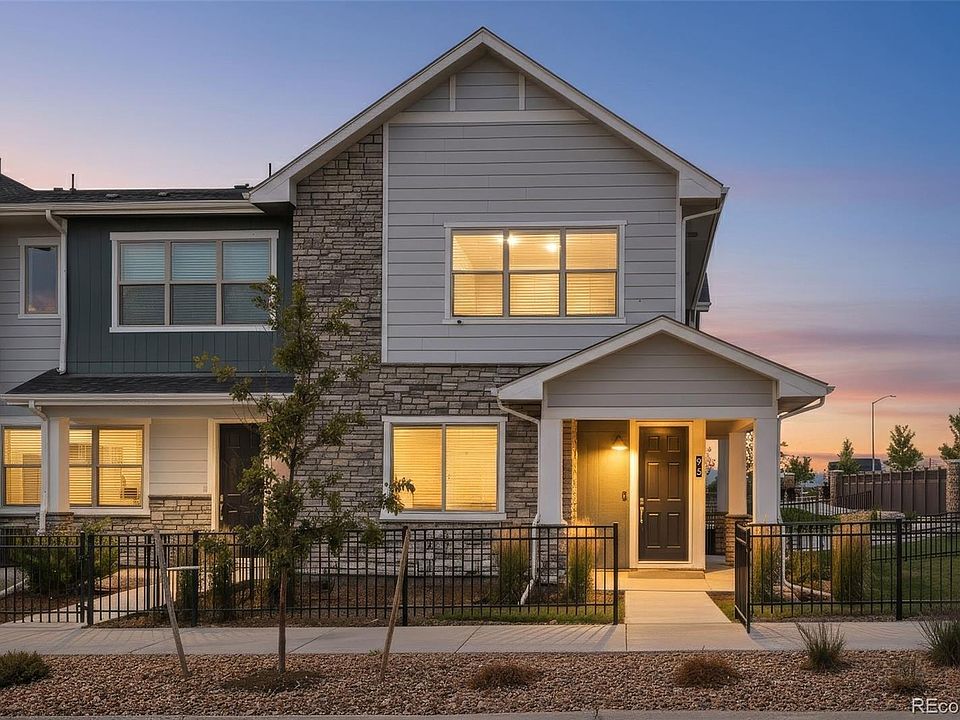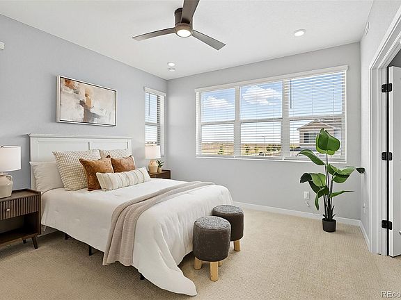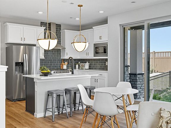 Gorgeous 2-story Model Townhome in Harmony • End Unit • 3B/3B • 1556 sq ft* • Alcott Enhanced Model w/ all the Upgrades • Solar paid off; transferrable Warranty • Never occupied (Sales Office/Model Home) • Low HOA/Metro • Open Space & Mountain Views • Attached, 2-car finished Garage • Main Floor Open-concept w/ 9' Ceilings, Recessed Lighting, Island Pendants • Designer finishes • Premium LVP, carpet and tile • Camera Security System • Spacious Primary Suite w/ 4-piece Bath & separate Water Closet • Oversized Primary Walk-in Closet • Wrap-around Porch • Fenced, Private Front & Side Yards w/ Sprinklers, maintained by HOA • Community Pool, Hot Tub, Fitness Center, Clubhouse, Dog Park, Sand Volleyball & Basketball Courts • Access to Parks, Playground, and 4 Trails • 1/4 mile to PK-8 Harmony Ridge • 5 mins to I-70, 22 mins to DIA