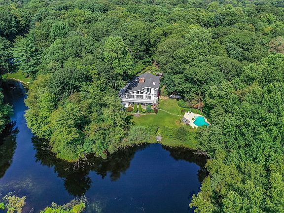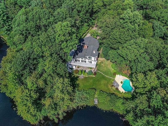 The private and perfect setting for full time living or as a country retreat. This contemporary ranch home is located on a tranquil, wooded 2.08 acres with lakefront access and beautiful water views. The in-ground gunite pool is one lovely feature as is the wrap around deck, spacious rooms, walls of glass and the 4 fireplaces. Vaulted ceilings allow for light and nature to stream through the house. The master area has a library with fireplace and full bath and an upstairs sleeping area with another full bath and ample closet space. The views upon awakening will make each day begin with a smile. The staff currently lives above the garage in a separately accessed 2BR, 1 bath apartment while another bedroom and full bath are located separately outside the lower level, used by the family as a cabana. With some TLC you can make this your dream home and enjoy peace and privacy, magnificent sunrises and sunsets on your own mini estate.