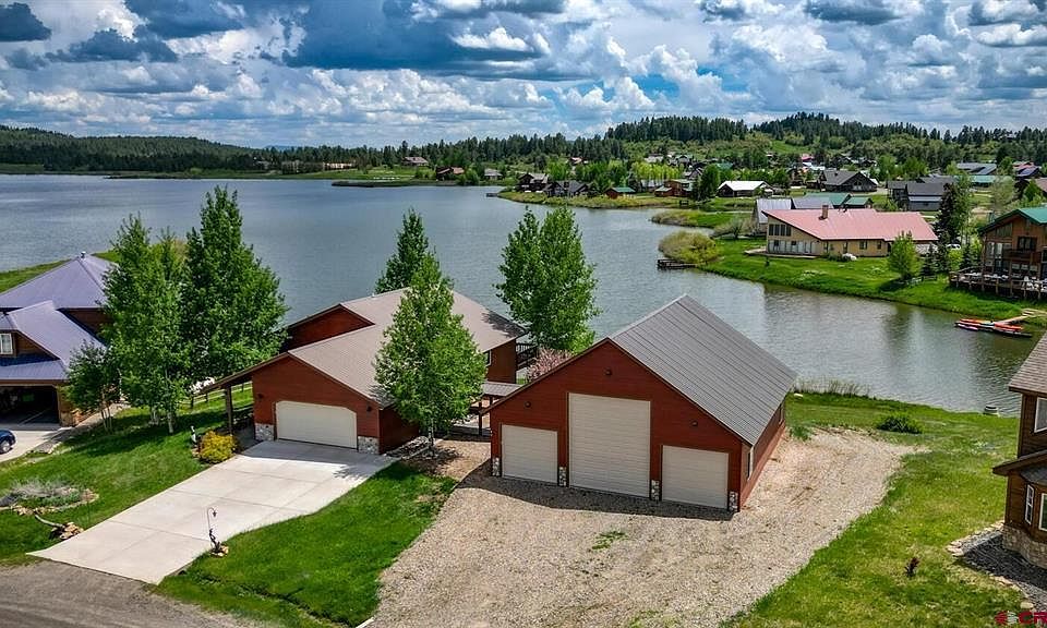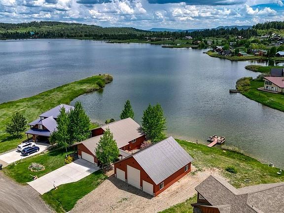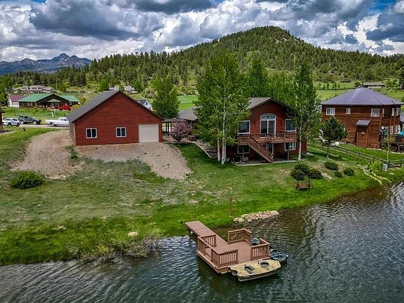 TRANQUIL LAKEFRONT LIVING...Life is the lake and the mountains in this beautifully custom built home that was specifically designed in every detail to capture every essence of this lakeside setting. This home exudes attention to detail in every room. Enjoy watching the loons and waterfowl in the early mornings and late evenings from a large deck off the dining area as well as watching the fox in the area hunting for their dinner and the Bald Eagles catching fish. Views are continuously changing as the sun moves across our captivating blue skies. The home was remodeled in 2008 with granite countertops and flooring. Enjoy the choice of two main suites either on the main floor or the lower level, lovely living room upstairs with cathedral ceilings, large windows with big lake views, gas log fireplace , big deck on main level, downstairs offers a second main bedroom and bath, a 3rd bedroom or office and a large family room and a walk out patio with lush landscaping with mature aspens. Owned & buried 1000 gallon propane tank. Walk down the path to your private dock (custom built 2021) with your canoe or fishing boat and explore the vast fishing and boating that Lake Hatcher has to offer. World class ice fishing in the winter is steps away. This home is extremely well maintained and cared for and is low maintenance. Home has been recently painted inside and out, newly stained deck, stamped overlay walkways & patio, newly refinished driveway (2021) and new appliances. Large workshop area in house garage with lots of built in storage. The RV garage is 36' x 42' (1512 sq ft, built in 2020) and fully finished on the inside with epoxy flooring. 30 & 50 amp receptacles for RV plug in and heated. Rear garage door allows for easy access and storage for a pontoon boat. This home offers gorgeous views of Lake Hatcher and Pagosa Peak. Some furnishings may be purchased in separate bill of sale or included based on offering price. Less than 15 minutes to Pagosa Mountain Hospital, Golf Course, Grocery and several Uptown restaurants. Enjoy the beautiful Rec Center with indoor pool, spa, racquet ball, pickle ball, yoga & spin classes all as part of your annual POA dues of $300. Separate fees depending on type of membership desired. 9 miles to Historic Downtown Pagosa Springs where you can soak in the Pagosa Hot Springs, walk along the San Juan Riverwalk, fly fish the San Juan River, hike Reservoir Hill, watch a movie in a 100 year old theatre or take in one of the many trendy mountain restaurants. 45 minutes to Wolf Creek Ski Area in the winter – think affordable skiing and lots of powder! Enjoy 2.5 million-plus acres of San Juan National Forest just minutes in almost any direction you drive, bike, walk or hike. National Forest gates are in abundance nearby. This is a lifestyle waiting to be experienced!! Call for an appointment now! What the seller loves about this home Beautiful lake and mountain view, huge RV garage, and private dock to enjoy. These exclusive lakeside properties are a rare find!