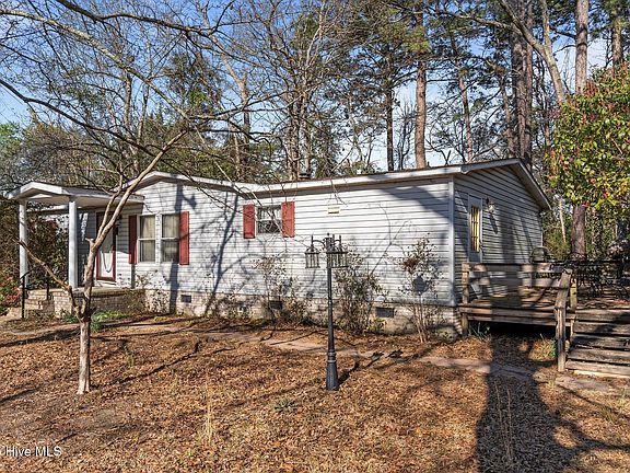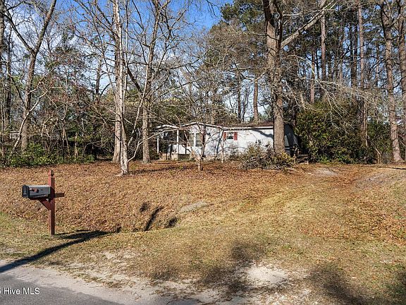 This spacious double-wide home is situated on a wooded lot in a quiet, friendly community in Rocky Point. This property offers great potential and is being sold As-is. A small front porch welcomes you into the living room, featuring a cozy fireplace. The eat-in kitchen offers a comfortable space for family meals, with a separate dining area for entertaining. The primary bedroom is located at one end of the home, complete with an ensuite bathroom and a walk-in closet. On the opposite end, two additional bedrooms, both with walk-in closets, share a second full bath. A pass-through laundry room leads out to a side deck, ideal for enjoying the outdoors.In the backyard, a storage shed with electricity adds extra convenience. With a little attention to the lot and a few updates, this home presents a great opportunity to settle into a peaceful, wooded setting in a lovely community.