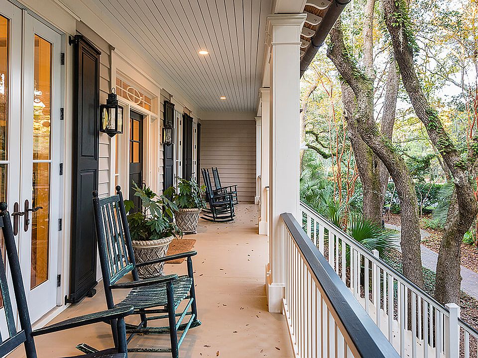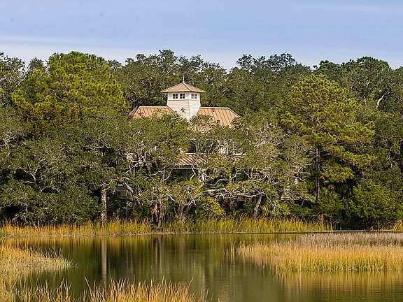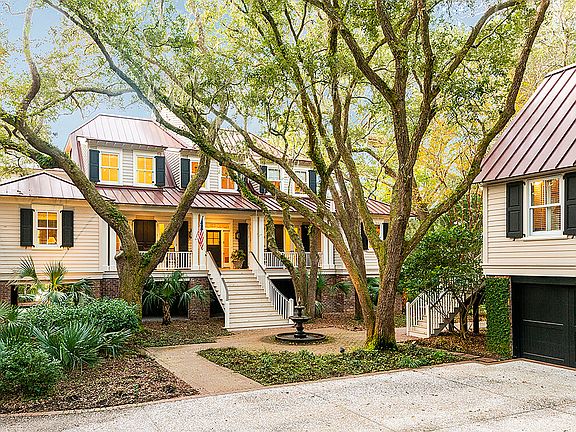 This exquisite home located at 95 Rhett's Bluff Road, and designed by acclaimed Kiawah Island architect Christopher Rose, enjoys marsh, tidal creek, and pond views. Mature landscaping surrounds this large corner lot located in the highly sought after Rhett's Bluff neighborhood which is a short stroll from the neighborhood's boat dock. The winding drive leads to brick paths around a welcoming three-tier fountain reminiscent of historic Charleston. The front porch, lined with rocking chairs, invites you into the upscale Lowcountry home. A wide foyer entry with a dramatic curved staircase rises three stories above heart pine hardwood floors which extend throughout the living areas. From the high-ceilinged dining room with beautiful white trim through the guest bar with sink, glass-fronted cabinetry, granite countertop, and wine fridge, to the living room framed by a gas fireplace and custom built shelves and two sets of French doors that spill out to a long covered porch, there is a feeling of complete comfort and relaxation. A charming side porch can open on spring days to take in the breezes or warm in the winter to become your favorite place to read. A window in the porch peaks into the kitchen which enjoys a beautiful marsh view amidst custom eggshell cabinets, stainless appliances, and center island, perfect for prepping food or enjoying a morning cup of coffee. The first floor also includes his-and-hers studies at opposite corners of the home, each with a vaulted beadboard ceiling and access to side porches, as well as a spacious master suite with French doors leading out to the veranda and a sunny bath with soaking tub, walk-in shower, and his-and-hers sinks. Take the stairs or elevator to the second floor, where you'll find the primary master suite with sitting area and fireplace, his-and-hers baths and closets, and dressing area. An oversized swing with plush cushions on the second floor screened porch will lure you to enjoy the morning sun flickering across the marsh and pond. The two spacious guest bedrooms on this level enjoy their own full baths. The stairs wind to a third-floor crow's nest with panoramic views. The separate guesthouse features a stunning in-law suite with a private entrance leading into an expansive bedroom with vaulted ceiling, sitting area, bath, and separate kitchenette. Located near holes no. 7, 8, and 9 of the River Course and Sasanqua Spa, additional features of this furnished home include two enclosed side porches offering extra seating or dining space, two dehumidified garages with five-car capacity, impact-rated doors and windows, and sound, security, and irrigation systems.