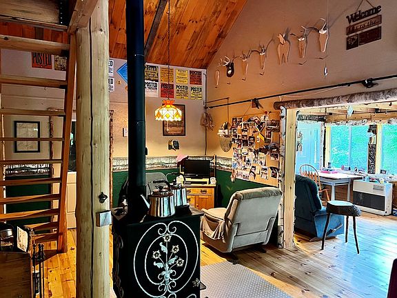 Welcome to 95 River Road, a charming off-the-grid cabin nestled in the woods just a 1/4 mile from downtown Bloomingdale. This rustic retreat offers a unique opportunity to escape the hustle and bustle and embrace a simpler lifestyle surrounded by nature's splendor. Situated on 22.85 acres of land, this cabin is a hidden gem. Surrounded by tall pines and enchanting foliage, the property provides a sense of tranquility and a constant reminder of the natural wonders that lie just beyond your doorstep. As you drive down the tree lined driveway, you'll be greeted by a quaint and welcoming getaway. Step inside, and you'll discover a cozy living space that effortlessly combines functionality and comfort. ]The custom built wood stove provides warmth during cooler seasons, adding a touch of rustic charm to the space. The cabin offers two bedrooms, providing ample space for you to unwind and recharge. Outside, the fire pit offers a picturesque spot to sip your morning coffee.