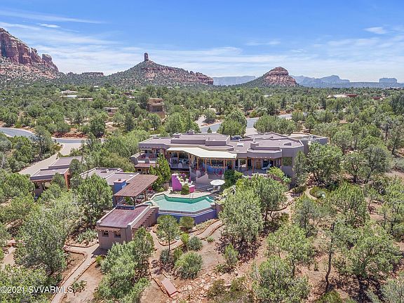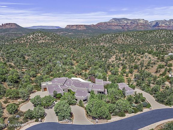 Come home to your own personal paradise! This extraordinary family home, in exclusive and gated North Slopes, is one of Sedona's most distinctive and luxurious estates. And, it comes turn-key! The price includes nearly all of the custom furnishings including thousands of dollars worth of precious artwork. Friends and family will share your delight in this timeless Contemporary Southwest residence. Surrounded by paths & gardens and bordering U. S. National Forest, this magical property has everything you could want in a luxury home. No detail has been overlooked in the Arrow B residence, designed by Carl Nelson and constructed by renowned builder, Randy Toogood. From the opulent built-in furniture to the dichroic glass cabinets to the latilla ceilings and accents. (pls click 'More') The attention to detail is unsurpassed. The front courtyard with its lush garden and water feature sets the stage for what's to come. Enter through the custom stained glass front doors and be welcomed by the jaw-dropping red rock panorama. The exquisitely designed open floorplan creates an indoor-outdoor flow that brings nature home and the home to nature. The organic architectural style, hints of Frank Lloyd Wright, takes full-advantage of Sedona's mild four seasonal opportunities for outdoor living. A cool, shaded patio, spanning the length of the home, overlooks the infinity pool and miles of forest and red rocks. Generous seating and dining enclaves surround a 60" grill and outdoor kitchen, making entertaining easy. Bronze sculptures and landscaping add to the outdoor ambiance. The property abounds with indigenous plants, cactus and junipers, some of which are over a hundred years old. The astonishing main level comprises the sumptuous Master Suite, Chef's perfect-for-entertaining Dream Kitchen, elegant Dining Room, lavish yet comfortable Living Room, splendid Media Room/Library, the World's Best Office with marvelous 270 degree views of Lizard Head, Thunder Mountain, Doe and Bear Mountain. The two work stations are perfect for remote executives. The center island and built-in cabinets with slide-out-shelves provide plenty of storage. The full-sized sunken bar in the living room, with customized etched glassware, is first class and features a built-in wine fridge, icemaker, dishwasher and refrigerator. Serious cooks truly love the professional-grade Kitchen, featuring three Dacor convection ovens, 48" Subzero fridge, a 6 burner gas range and two Asko dishwashers. Tons of kitchen storage in addition to the walk-in pantry. Downstairs, family and friends are embraced by two Guest Suites, each with its own patio, a Media-Living Room and fine Wine Cellar. Beyond that is the fabulous, spacious, and well-appointed, stand-alone Guest Casita. Furnished with a living room/kitchen, jacuzzi and washer/dryer, it exudes a wild west feel your guests will love. In yet another building is the state-of-the-art Fitness Center with a bathroom, floor to ceiling window, mirrored wall, and rainfall shower. Close by is the magnificent infinity pool and spa replete with waterfalls and red rock views. After chilling in the pool, guests can shower and change in the cabana, just steps away. Listen to music and enjoy cocktails on the rooftop deck with dazzling 360 degree views - perfect for taking in spectacular Sedona sunsets or stargazing. Downstairs there's a generous basement for storage and a Game Room (aka, Man Cave) with a pool/ping pong table and professional card table. This magnificent and meticulously maintained home is ideally located in West Sedona, minutes from shopping, hiking, restaurants, theaters, and wonderful arts, film, and music festivals. You won't find another like it!