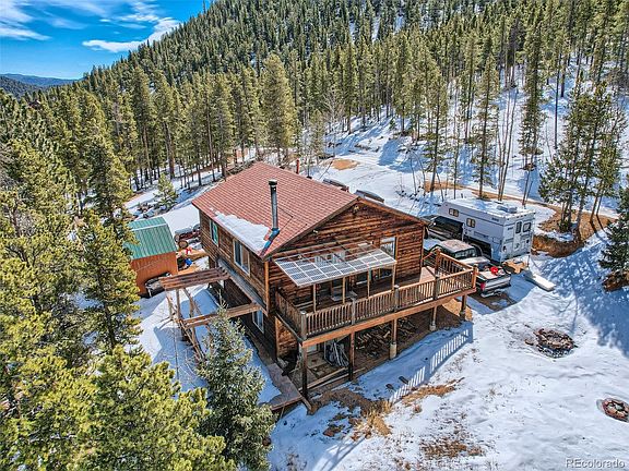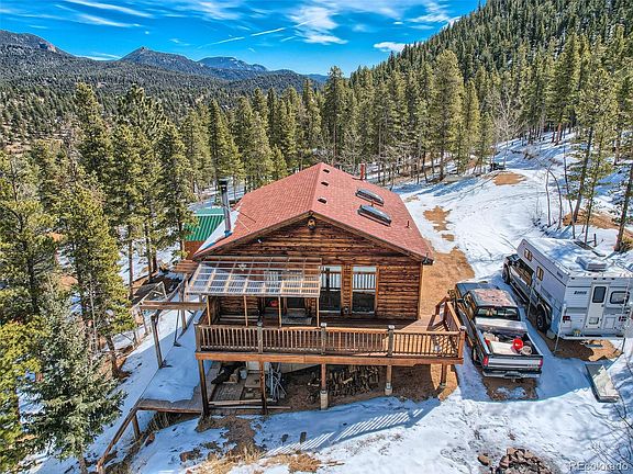 For those wanting a cozy mountain home with amazing views, look no further. This 3-bedroom, 1.5-bathroom single family home sits on a well located, lot in Bailey's friendly, Harris Park Estates. The front porch with stunning mountain views brings you in to the great room with a wood burning gas stove fireplace in the corner surrounded by a natural stone backdrop. A slightly vaulted ceiling showcases a skylight above the eat in kitchen with floor to ceiling windows overlooking the front porch and forested mountain backdrop. The kitchen is finished with white cabinets and smooth concrete countertops. Down the hall, you'll find a full bathroom, with a sky light, followed by 2 bedrooms on either side. And downstairs, enjoy the second open living area with family and friends and find a guest or 3rd bedroom/home office and a half bath. Back upstairs, take in the endless views and fresh mountain air, from either the front porch or the UNFINISHED side deck for a morning coffee or sunset view. This property has an older chicken coop. and 2 large sheds. Enjoy activities like hiking, fishing, 4 wheeling and more. Come see this beautiful mountain property today.
