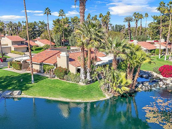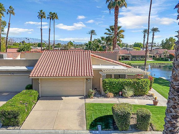 Exquisite Lakefront Condo! Discover this former model home, perfectly situated in one of the most desirable locations within the Rancho Mirage Racquet Club. This stunning condo offers direct lakefront views, surrounded by lush landscaping and breathtaking mountain vistas. Featuring a spacious 3-bedroom, 2-bathroom layout, the home has been beautifully updated with a modern kitchen, quartz countertops, stainless steel appliances, and porcelain tile flooring throughout. Dual pane windows and sliders enhance energy efficiency and comfort. Enter through the elegant glass double doors into an open floor plan with high beamed ceilings, where natural light flows from the interior atrium, creating a welcoming ambiance. Ideal for entertaining, the large island extends into the main living areas, perfect for hosting dinner and cocktail parties. The serene patio off the living room overlooks the lake, offering a private oasis. The grand primary bedroom boasts an oversized cedar-lined walk-in closet, while the spa-like primary bathroom features a double vanity and a zero-entry shower for easy access. Two guest bedrooms share an updated bathroom with direct entry from one of the bedrooms. Additional conveniences include an indoor laundry room and a garage with epoxy flooring. Rancho Mirage Racquet Club is a gated community with active amenities, including tennis, pickleball, clubhouse and gym. Its proximity to restaurants and shopping ensures a convenient lifestyle.