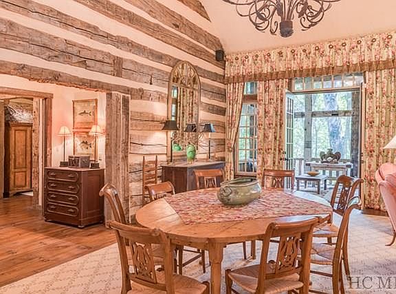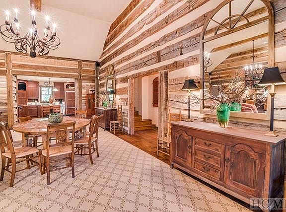 Captivating luxury log home with guest house featuring modern rustic appeal located close to downtown Highlands in the small ridge-top community of Highgate. As you enter the main home, you are welcomed by the stunning great room with stone fireplace and cathedral ceilings opening to the gourmet kitchen, wet bar, and dining area making for easy entertaining. So many unique features impress you from the dutch doors and exposed hand hewn logs to the beautiful wide plank flooring, reclaimed wood siding accents, and beautiful stacked stone fireplaces. Main floor also includes a cozy den, guest suite with fireplace, and the spacious master ensuite with two adjoining private rooms. Two additional guest suites are located on the second floor. Relaxing is easy on the screened-in back porch with warming fireplace for those chilly mountain evenings. Privacy can be enjoyed in the guest home with two bedroom suites, one with fireplace, and comfortable living area with fireplace and kitchenette. Beautiful mature terraced gardens adorn the property and feature stone columns, sitting areas, moss enclosed stepping stones throughout, and a vine decorated pergola.