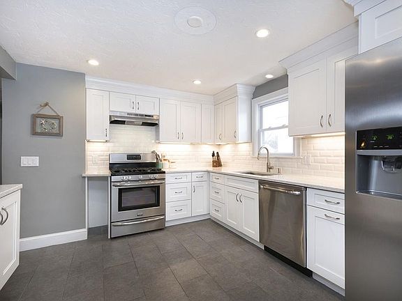 Picture perfect home in desirable Rexhame Village! Appealing and stylish, this fully updated home was well designed with attention to space and detail! A welcoming, open concept upper level features a kitchen, dining room, 2 bedrooms, updated bath and boasts gleaming hardwood floors and recessed lighting. The kitchen is stunning with white Shaker cabinets, quartz counter tops, stainless appliances, subway-tiled back splash and tiled floor. The spacious and fully finished lower-level has natural hickory hardwood floors throughout, a generously sized family room, and master bedroom with walk-in closet. Plenty of windows allow an abundance of natural light to stream in making it bright and cheery. The outdoor space has a newer Azek deck, fenced-in yard, outdoor shower, patio, and shed and beckons for outdoor entertaining! With nothing to do but move in, spend your days in the water and sand and your evenings under the stars! Conveniently located to area shopping, restaurants and downtown!