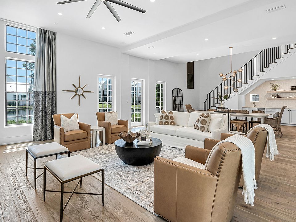 Attention boaters, a deep-water boat slip with lift is available with this home! Ideally situated on a beautiful spring-fed lake, this stunning design by Savoie Architecture provides the perfect opportunity to experience the laid-back coastal lifestyle of Churchill Oaks. The spacious first floor features an open living area centered around a modern ribbon fireplace and grand dining room with a full wet bar. The chef's kitchen, with beautiful quartz countertops, custom cabinetry, and Thermador appliances, overlooks the dining area and courtyard. Custom finishes throughout include hardwood white oak floors, tongue-and-groove kitchen ceiling, and Venetian plaster accent walls. The ground-floor main bedroom opens into the private courtyard with a pool, summer kitchen, loggia and lounge area.. The second level includes three additional guest bedrooms, all with en-suite baths. This home is offered with a 35' deep-water boat slip in the Churchill Oaks marina, including a 16,000lb capacity lift. If you seek a luxurious escape in one of northwest Florida's most sought-after coastal communities, look no further!