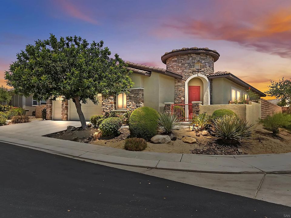 Huge Price $$$ Reduction...Priced to Sell quickly for Largest Model in Tuscany. Prime Location in the Gated Community..Rarely available Chardonnay model home is located on a corner lot /prime location in Florentine Collection of Tuscany. This model w/4BR/3/5BA 2803ESF w/3 Car Garage..one walled off/separate for workshop or storage etc It is the largest home in Tuscany. Ideal for seasonal home or long term rental w/one BR/BA casita-like separate in front for guests. Home also features 10' volume ceilings with $$$thousands in upgrades incl. custom mosaic tile in entry,upgraded tile & carpet flrg, security & audio systems,dual zoned heat& air, gourmet kitchen w/island w/slab granite counters, maple cabinetry, stainless appliances, butler pantry w/wine cooler refrig, Large great room w/media niche & fplc. You'll enjoy the huge master bedroom w/walk-in closet.Mstr Bath w/oversized soaking tub & walk-in glass block shower. Mstr BR w/direct exit to spacious low maintenance bkyard w/amazing views of the San Jacinto mountains, large patio, ceiling fans & custom party spa w/swim up bar stools. Low HOA fee only $227 per month includes community pool and spa, cable and internet, community dog park,tot, beautiful greenbelts behind gated community for walking,jogging,etc ..!