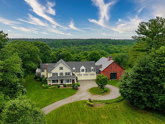 OPEN HOUSES CANCELLED. Beautifully set back on scenic country road abutting conservation land with direct trail access, enjoy 5+ manicured acres and a totally restored Antique 3-story New England barn with this exquisite Greek Revival Farmhouse. Incredible details including transom entry ways, fine millwork & more. No detail has been overlooked. The comfortable, easy-flow floorplan boasts rich southern pine floors, fireplaced living and family rooms, a cheerful sunroom w/270-degree views and dining room w/built-ins. Chef’s kitchen w/island and sunny breakfast room offers patio access, plus mudroom and home office/guest room w/full bath. 5 sunny BRs and 3BAs upstairs include a sumptuous primary w/walk-in closet, private roof deck gifting sunset views, double vanity bath plus a luxurious office w/gas fireplace. Newly finished LL has full bath, steam and sauna. Car enthusiasts enjoy the heated garage w/epoxy floor & air comp. Home automation sys, whole house audio and outdoor entertaining