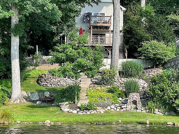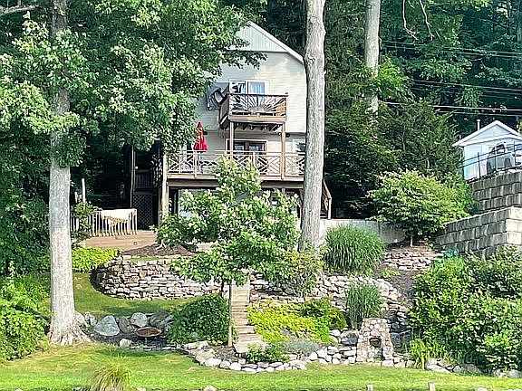Gorgeous lakefront home with 2 incredible decks overlooking the water, including one off of the primary bedroom. This beautiful single-family home boasts vaulted ceilings, hardwood and natural stone floors, quartzite and granite countertops, 4 skylights and a charming stained-glass feature that captures the natural light. Two great bedrooms upstairs, 2 full bathrooms and a finished basement offers more space as well. The landscaped, fieldstone backyard is the perfect spot to sit by a fire pit and enjoy the breathtaking sunsets over the lake. Clean, fresh coat of Benjamin Moore neutral shades throughout. Detached 2 car garage with storage loft on its own lot. Parking for 6 cars + 2 in front of the house on recently paved driveway. Be on vacation every day in this truly special home.