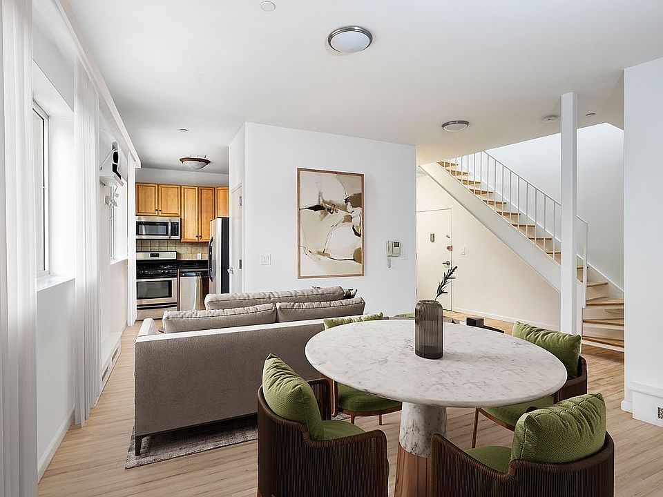 Welcome home to residence #1A at 93 Wyckoff Avenue, an exceedingly rare and special 3BR/3BA in the heart of Bushwick. This one-of-a-kind duplex offers 1,370 square feet of smartly apportioned space for grand gatherings and working-from-home alike. The apartment opens up into a large foyer that leads to a sun-drenched living-and-dining room, highlighted by tall ceilings and brand-new hardwood floors; the kitchen boasts stainless steel appliances (including a dishwasher) and plentiful counter space for meal prep and entertaining. Completing the first level is the first of three full bathrooms, in-unit, double-stack W/D, and LED light fixtures throughout; the entire floor is illuminated by a wall of northwest windows. Head upstairs and you’ll find three king-sized bedrooms, each equipped with plenty of storage, light, and privacy. The primary has its own en-suite bathroom; the second bedroom has an en-suite balcony that overlooks Wyckoff Avenue. Any of the rooms can easily function as a home office, den, playroom, guest room, or home gym…the possibilities are endless! 93 Wyckoff Avenue is a boutique, 9-unit condominium that’s perfectly tucked away from the city’s everyday hustle yet just one block away from the L train. The building has a common roof deck with 360-degree views of Brooklyn and downtown/uptown Manhattan. Nearby perks include Key Food across the street and Maria Hernandez Park nearby. Contact us today with any questions or to arrange a private showing!