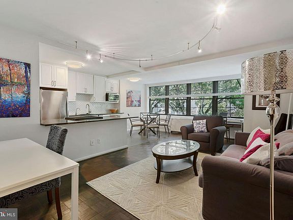 This generously proportioned one-bedroom one-bath co-op with GARAGE parking space has been handsomely and thoroughly renovated. Filled with sun from tall east-facing windows, the open floor plan provides a large living room, separate dining area, and beautiful kitchen with granite counters and breakfast bar, plenty of cabinet space, and stainless steel appliances, including a full-sized gas range and dishwasher (note: white backsplash is temporary stick-on tile - see photos for image of permanent tile beneath!). The spacious bedroom has a wide closet with built-ins, built-in bookshelves, and a wall of windows with pretty views of trees. The full bath has been updated to include a walk-in tile shower with sliding glass doors, modern vanity, and slate tile floor. In the hall, you’ll find a walk-in storage/coat closet and linen closet, both with built-in shelving, for great additional storage. The monthly co-op fee includes the underlying mortgage payments of $176.20/month for the unit and $25.81/month for the parking space, property taxes, and ALL standard utilities (gas, electricity, heating/cooling, water, sewer), as well as the fantastic amenities of the Claridge House Cooperative (rooftop pool, fitness center, business center, bicycle storage, common laundry, 24-hour front desk, elevator, common areas, free lobby wi-fi, and more). Sorry, no pets allowed. This terrific location in Foggy Bottom near the is mere minutes from Metro, shopping, dining, Whole Foods, GWU, downtown, and the Kennedy Center, with easy access to K Street, Virginia Avenue, Rock Creek Parkway and local bike and jogging trails, the Georgetown Waterfront, and Route 66. Walk Score of 95!