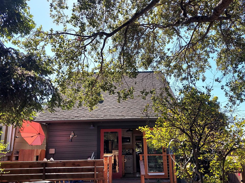 Two-story house, bright bedrooms, open architecture with kitchen leading through french doors to a large back deck suitable for outdoor dining or workspace. Look out toward the creekbed landscape sheltered by beautiful oak and redwood trees. All situated on a bike boulevard and walkable to BART, 3 mi from UC Berkeley, 2 mi. from Bay Bridge to SF. Cultural and foodie havens galore; renowned Berkeley Bowl grocery and Tues farmer's market nearby! Quiet setting; friendly and much-desired neighborhood with a vibrant community of diverse neighbors. Merging from nearby Emeryville and Berkeley it has walkable dining, cafes, entertainment and shopping. Urban and active, with beautiful older homes and new live/work developments. Its a changing young hipster and growing family area with great people, art galleries, knitting shop, urban re-use store, coffeehouses, new cool restaurants. Sustainability-minded, beekeeping and chicken-coop-hosting locals. Urbanly renewing, sometimes gritty, always interesting. Non-smoking interior, no pets. Minimum credit score 700; application required from each adult occupant. This main house shares the garden and splits utilities monthly with cottage tenant: gas, electric, garbage, water and high-speed fiber internet. Ample street parking.
