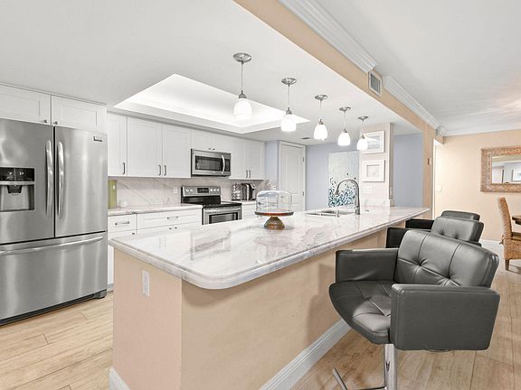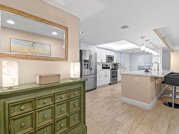 Welcome to your dream luxury retreat in Florida! This exquisite 1st-floor condo offers an unparalleled indoor-outdoor living experience, perfectly situated on the shores of a serene lake and just steps away from the resort style pool. As you step inside this meticulously designed residence, you'll be greeted by the finest high-end designer furnishings, creating an ambiance of modern coastal sophistication. The entire space has been thoughtfully updated with shaker-style cabinets, custom lighting, and quartz countertops, showcasing the utmost attention to detail.