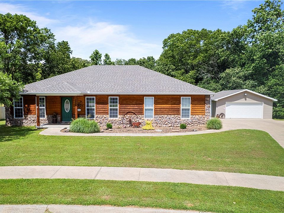 Looking for Extra Outdoor Space? Wrapped with a gorgeous treeline to enjoy the Ozarks Beauty, this well maintained 3/2 has and extra lot for a total of .87acres and a 24x24 detached garage. Grab a cup of coffee and enjoy nature from the covered back deck. Open concept with Beautiful gas log fireplace. Growing town with several new businesses. Just minutes to WM Home office, 549 and Beaver Lake. Don't Miss This One. WELCOME HOME!!