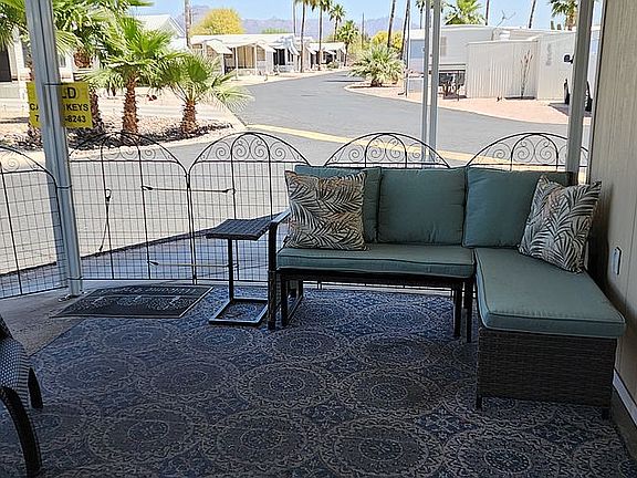 2007 CAVCO Park Model 11 ft x 35 ft 385 sq + Bonus Room, Large Patio with views of the Superstition Mountain, and covered parking - Furnished! Ready for you, your family, and friends to enjoy! - Tasteful newer furnishings and modern décor in this one Bedroom, 1 Bath home - plus a spacious bonus room with wall mounted smart TV and gorgeous electric fireplace. - Spacious pet friendly shady patio and separate carport - Step from patio thru a French door entry into a large bonus room with gorgeous electric fireplace and TV, perfect for entertaining - Sofas in living room and bonus room convert to beds (sleep 6) - Kitchen has white appliances including a full-size refrigerator, stove, built-in microwave, and lots of cabinet space - There is additional storage in the hall, including a double door closet w/built-in drawers below and a full-sized pantry - Bedroom has lots of built-in storage, large double door closet - Bathroom tub/shower combo, a spacious vanity, linen closet - There is a washer and dryer in a closet in the bonus room, and an additional 2nd full sized refrigerator/freezer - Newer cordless cellular blinds throughout - Central heat and air conditioning - A mix of stone tile and laminate flooring - Smaller Craftsman shed for storage - Community has pool/spa, short walk to the American Legion - Budget friendly lot rent and taxes Represented on behalf of the owner by Cactus Keys Mobile Home Sales, LLC Arizona Department of Housing License number - 8972