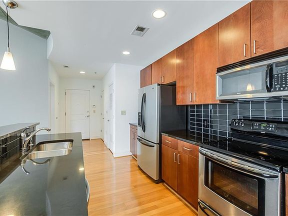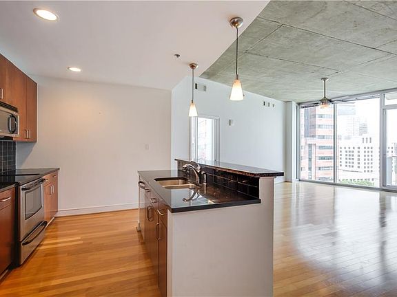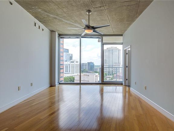 Perfect roommate floor plan. This natural light filled end unit on the 17th floor features two bedrooms, two baths, hardwoods on main and kitchen, stainless steel appliances, washer and dryer, and large balcony with eastern views. Walkable to MARTA, shopping, Piedmont Park, the Beltline, Georgia Tech, Georgia State, and Mercedes Benz Stadium.
