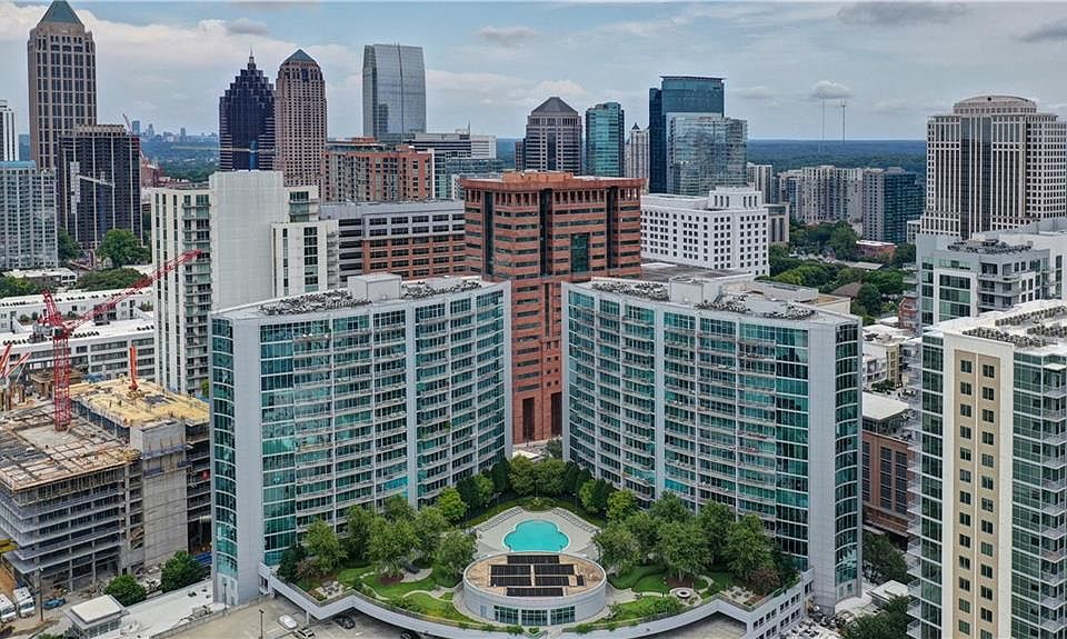 RARELY AVAILABLE HIGH FLOOR 2/2 WITH AMAZING CITY VIEWS, AS WELL AS, VIEWS OF THE ACRE PLAZA GARDENS AND POOL. FRESHLY PAINTED WITH NEW HIGH END CARPET IN BEDROOMS AND READY TO MOVE IN! POPULAR FLOOR PLAN WITH SPACIOUS KITCHEN WITH LOTS OF CABINETS, STAINLESS APPL, GRANITE AND TILE BACK SPLASH. GRACIOUS LIVING/DINING ROOM WITH FULL WALL OF FLOOR TO CEILING WINDOWS AND EXPANSIVE BALCONY. HARDWOOD FLOORS IN ALL THE PUBLIC SPACES, 10' CEILINGS, CUSTOM REMOTE ROLLING SHADES, PRIMARY BEDROOM WITH CUSTOM CLOSETS, BATH WITH DOUBLE VANITIES, SOAKING TUB AND GRANITE WITH LINEN NICHE, GUEST BEDROOM WITH PRIVATE BATH. COAT CLOSET AND DEDICATED LAUNDRY CLOSET WITH NEWER W/D. HVAC REPLACED IN THE LAST COUPLE YEARS. ENJOY RESORT-LIKE AMENITIES INCLUDING PLAZA LEVEL POOL, FITNESS CENTER, FIRE PIT AND LOUNGE AREAS, GAS GRILLS, 24-HOUR CONCIERGE, ON-SITE SECURITY AND MANAGEMENT. ACROSS THE STREET FROM THE MIDTOWN MARTA, ON THE TECH TROLLEY LINE, ELEVATOR RIDE AWAY FROM PUBLIX, MARLOW'S TAVERN AND PLENTY OF RETAIL AT STREET LEVEL. FINANCIALLY HEALTHY HOA, DOG RELIEF AREA WITHIN PARKING GARAGE, TWO SIDE BY SIDE, COVERED PARKING SPACES, FHA APPROVED COMMUNITY.